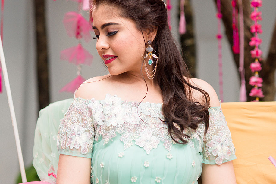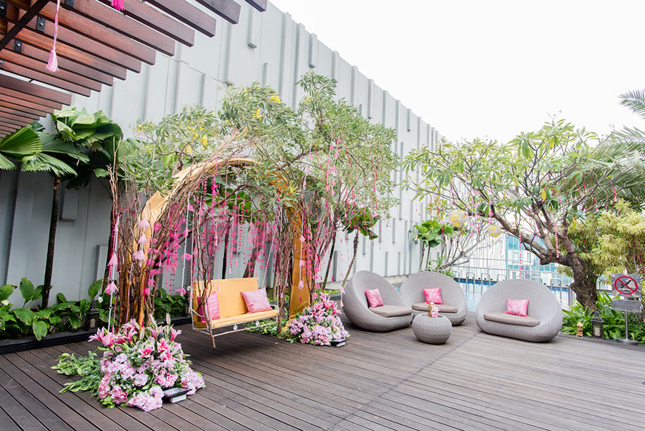 Natasha and Amrit’s mehndi function was a based on a fairytale theme and had a recurrent pink and white color scheme throughout. The mehndi function was hosted at the poolside of the Holiday Inn Jakarta Kemayoran and was entirely decorated with pink florals and quirky props. The bride wore a gorgeous sea green princess gown by Natasha Asoka l’Atelier and accessorized it with a floral tiara and statement earrings from Minerali.