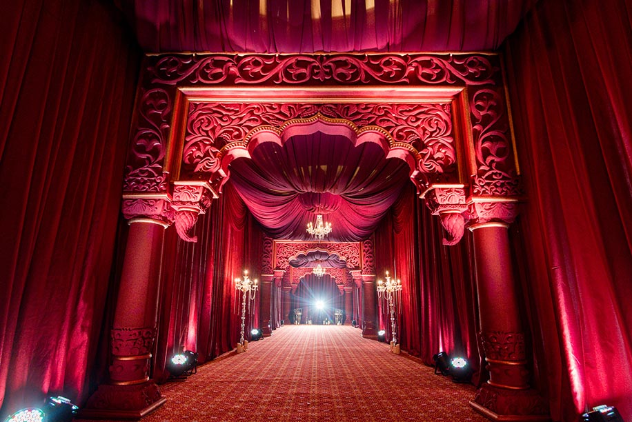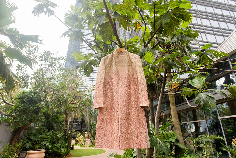 The wedding was hosted at the very glamourous Ritz Carlton Jakarta and had guests talking about its fabulous decor. It was inspired by the antiquely designed walls in the Sabysachi store in India. With a special photo wall dedicated to the couple’s memories and a grand welcome setting, the decor was a complete stunner. The red, purple and gold colors set the tone for the décor and bold touches like gold/champagne chairs created a wonderful sense of drama. Natasha looked every bit of a maharani in her blush gold Sabyasachi Mukherjee lehenga and Raabta by Rahul’s statement jewellery while her beau wore an embellished Sherwani in the same color.