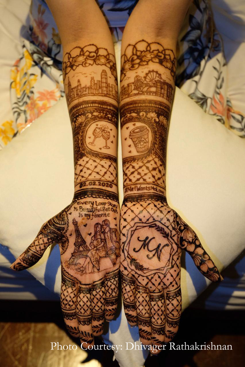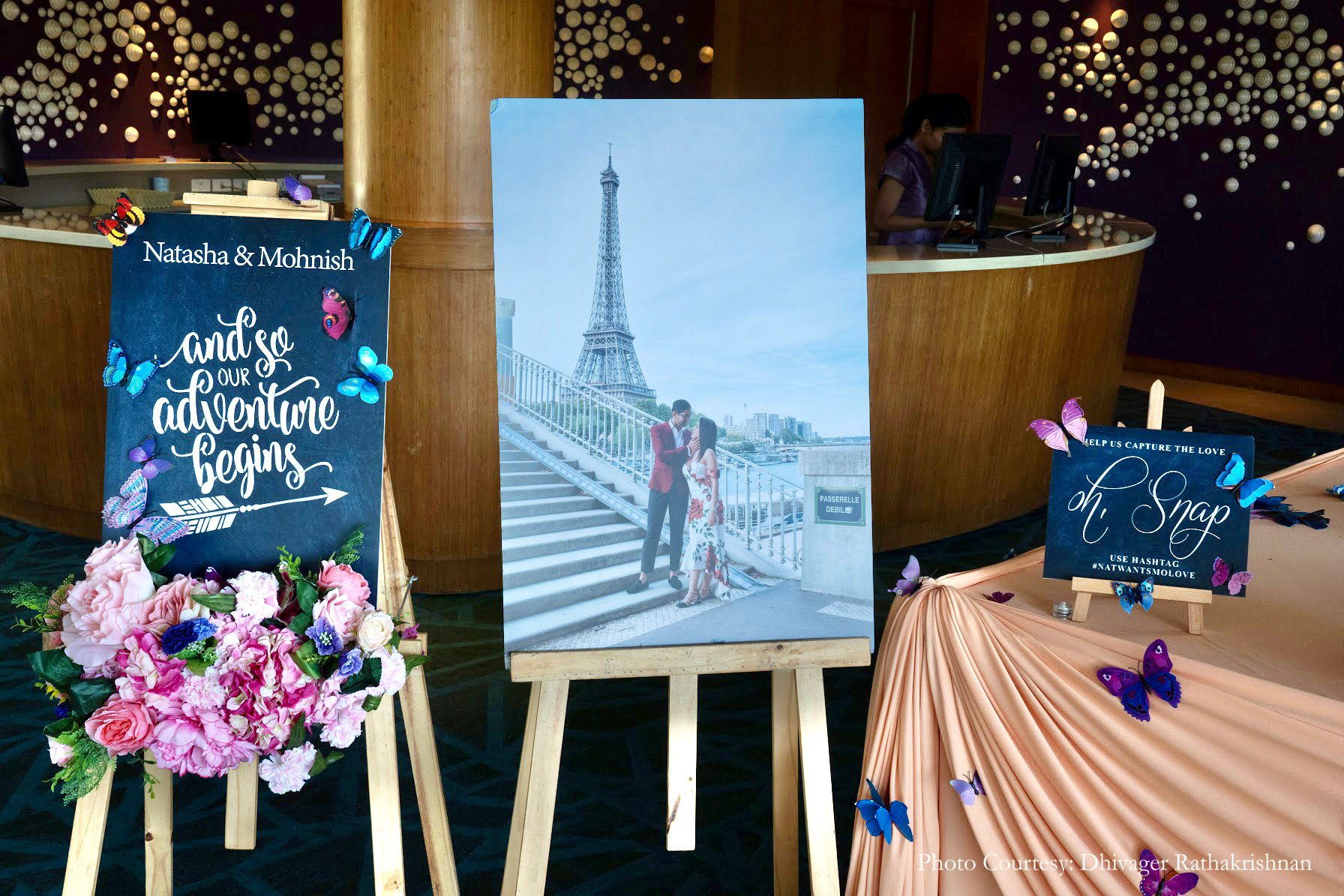 The festivities kicked off with the Ghari Pooja and Mehndi function. For the indoor celebrations, the decor was kept fresh and lively in hues of yellow. The bride donned a teal blue and pink lehenga from Pix Boutique and teamed it with matching floral jewellery. Natasha’s hands were adorned with Mehndi that depicted elements from the couple’s relationship, like their love for coffee and wine, Hong Kong and Singapore skylines, their wedding logo and their pre-wedding photoshoot in Paris.