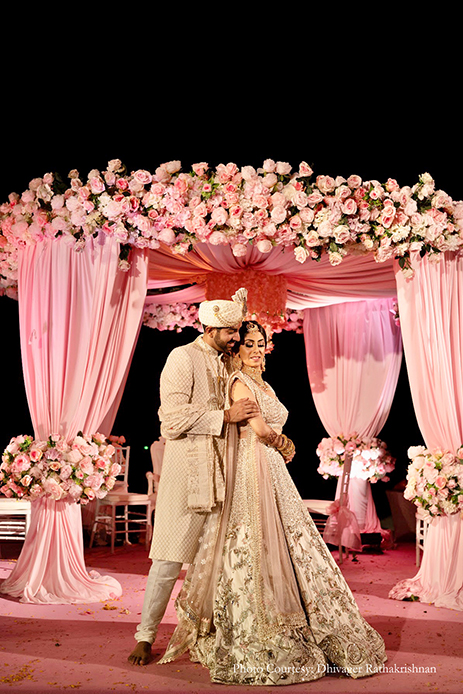 The wedding was a serene affair along the beach with some romantic pastel pink decor, an eclectic round mandap festooned with blooms and a breathtaking view of the ocean beyond. The bride wanted a custom made lehenga that depicted their love story to signify the start of their new life, and her dream outfit was an alluring shade of blush created by designer Anjali Mahtani.