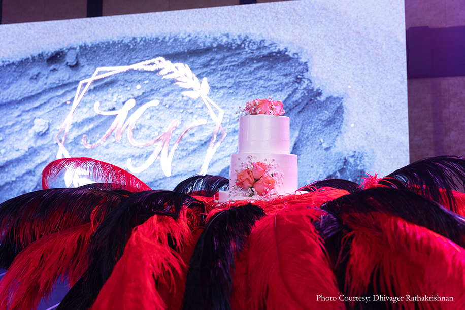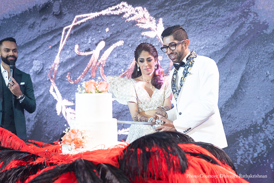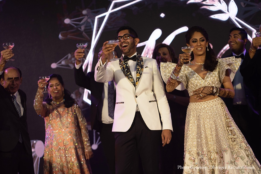 For the final reception dinner, the decor exuded a Gatsby-ish glamour with grand props, red roses and more. The bride wore her wedding lehenga paired with a dramatic blouse by the same designer for a distinctively contemporary, showstopping look.