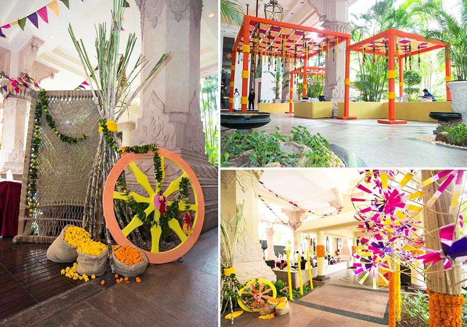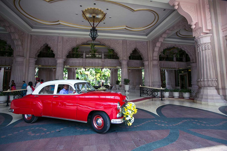 We got married at The Leela Palace in 2015. The hotel is a jewel in the middle of Bangalore. We wanted our wedding venue to be a mix of vintage and contemporary, and the hotel with its impressive Grand Ballroom was the perfect choice. The picturesque staircase and arched windows of this beautiful property provided perfect frames for photographs. A vintage red and white Ambassador decorated with floral arrangements added a further retro vibe.