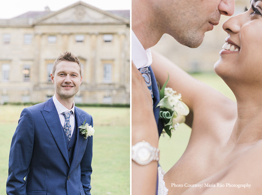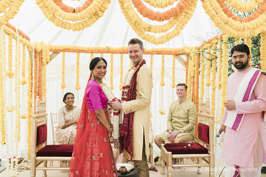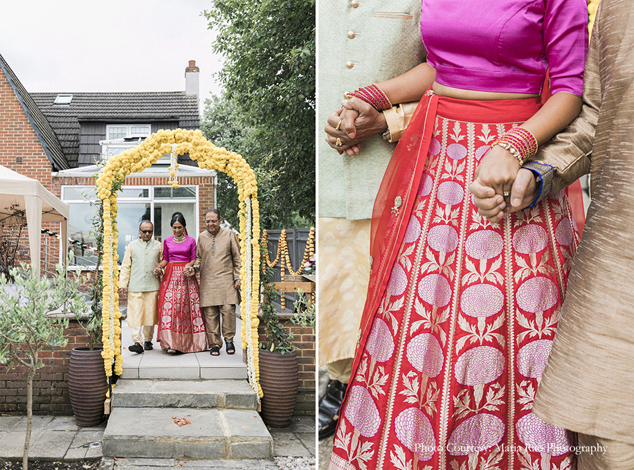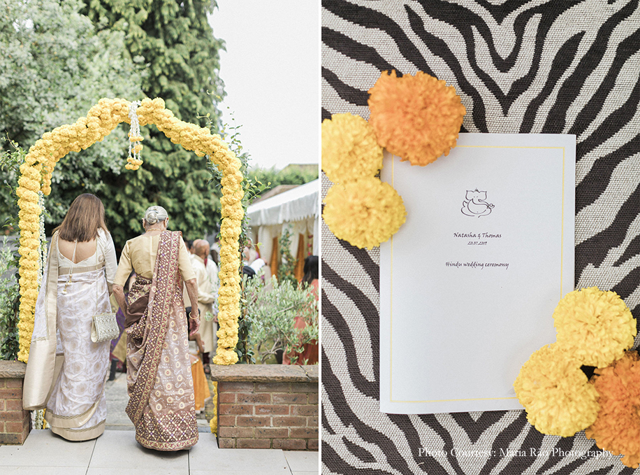 The Indian wedding was organized in the front garden of the bride’s familial home and was a vibrant affair with lots of flowers. She shares, “Thomas had never been to an Indian wedding. So his first ever experience of an Indian wedding turned out to be his own, and he loved every second of it. For the ceremony, I wore a purple blouse with a silk Raw Mango lehenga which my mother purchased in India. She also procured Thomas’s wedding outfit from India as well.”
