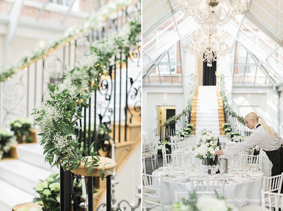 The civil ceremony was held at Botley’s Mansion, a heritage property, in Surrey. The function took place outdoors, and the reception that followed the civil ceremony was hosted inside the atrium with a beautiful glass roof. The decor was classy with a profusion of white flowers. Natasha wore a cathedral veil and a strapless lacy gown from Pronovias, while Thomas opted for a blue three-piece suit from Reiss.