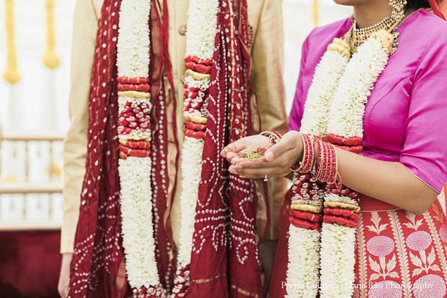 Talking about the planning process, the bride shares, “My mum and aunt are both florists and put together the mandap with beautiful marigold blooms customary to Hindu rituals. Our guests felt transported to India when they arrived.”