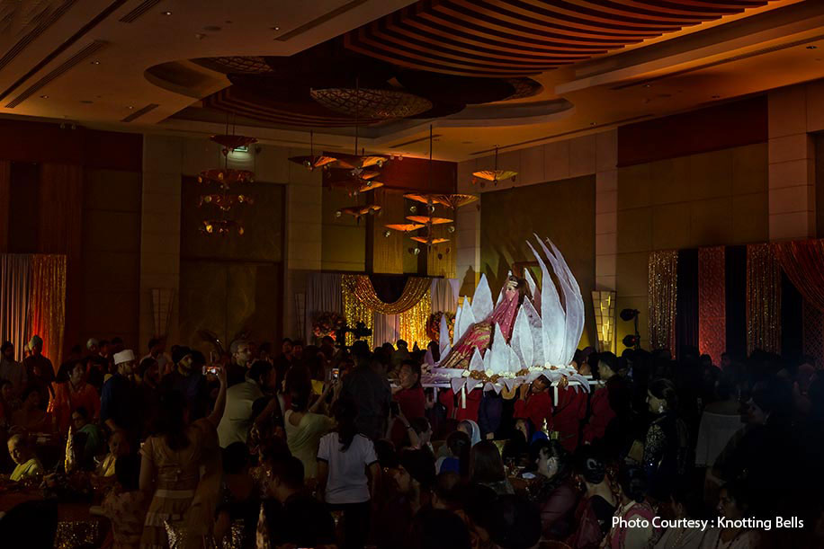“We had our sangeet on the same night, soon after the mehndi was over. The theme for this function was a nod to the places that Karan and I were brought up in, namely, Thailand and Dubai and it was called ‘Arabian Nights in Siam’. The decor was a fusion of Middle Eastern and Thai elements. I entered the venue sitting on a large lotus while Karan entered with Thai and Arabian dancers leading the way with his groomsmen following him. This was the formal welcome dinner for all our guests.”