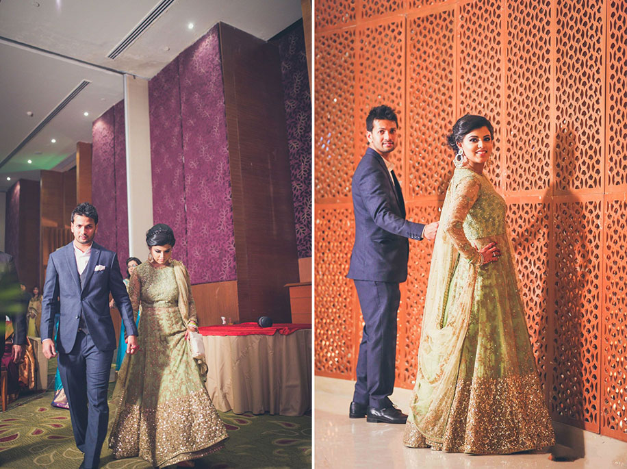 “The reception was held at the Radisson Blu hotel in Haridwar. I wore a pretty green lehenga with gold thread work from Frontier Raas store in New Delhi, and kept the jewellery to a minimum. Nishith wore a gray suit from Zara Men, belt from Louis Vuitton and shoes by Aldo.”