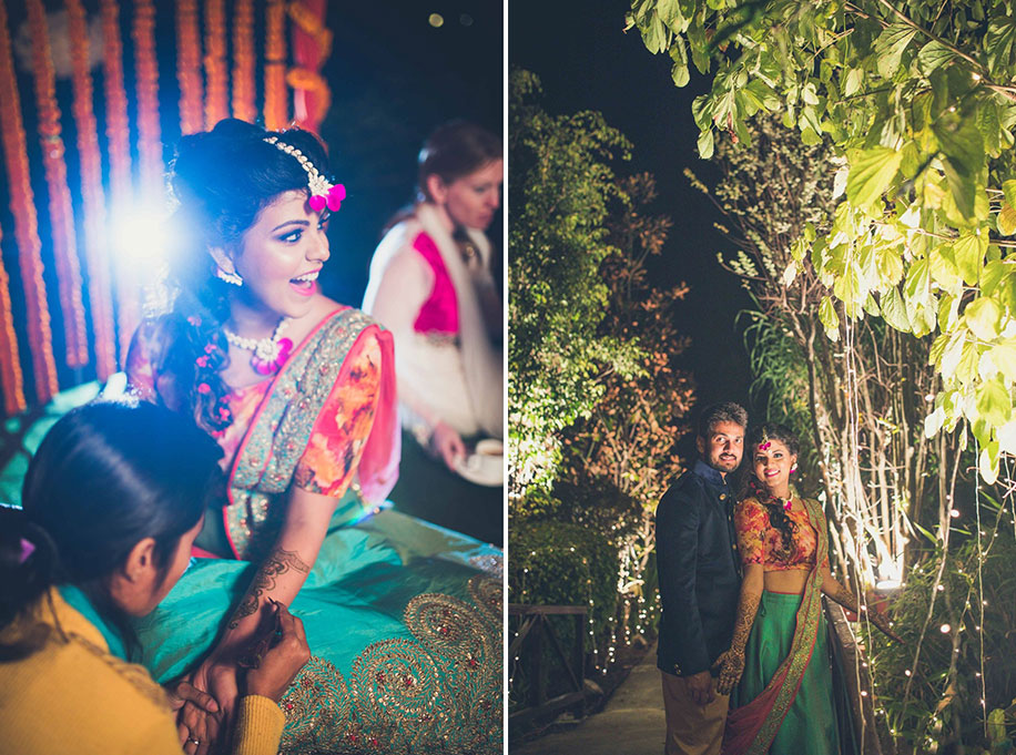 “The mehndi and sangeet ceremonies were held on the same day. The decor theme for the mehndi function, which was held outdoors, was primarily green. Guests had fun dancing as the mehndi session got underway. As evening approached, we had to move indoors because it had grown dark and the Jim Corbett National Park does not allow music to be played loudly at night to avoid disturbing wildlife. There was a bonfire lit outside as night fell, and the ‘official’ sangeet was held indoors. We started with solo performances, and then everyone celebrated together on the dance floor.”