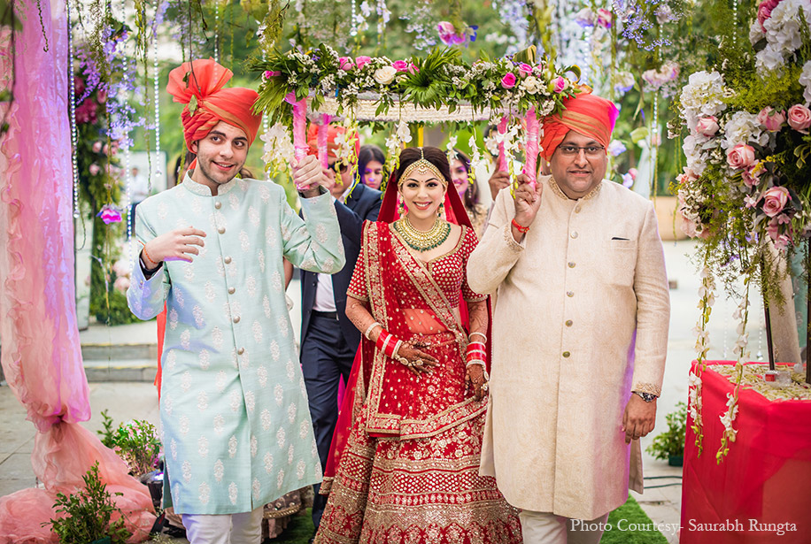 “The Pheras were the highlight of the ceremonies. I always dreamed of an English garden theme for my wedding in a unique and informal setting. So we designed the décor to include drapes and garden roses in soft pastel combinations of lavender, pale pink, white and peach against a rustic green wall. The tables had overlays and centerpieces with candles and florals in a similar palette, as did the packaging of our favors and other collaterals like itineraries and snack hampers that were placed in guest rooms. We decided to introduce bright colors with the safas – turquoise safas for the baraatis and coral safas for the ladkiwale. While I wore a red Sabyasachi creation, Sharan looked handsome in a nude pink raw silk sherwani.”