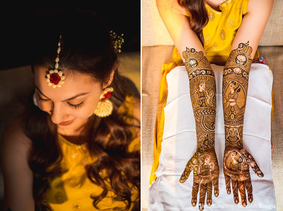 “We kickstarted the events with an intimate mehndi ceremony at my residence. The décor was all about bright florals and colorful props. For this function, I wore a sleeveless Banarasi silk kurta in mustard with hand-embroidered highlights and wide-legged cropped palazzos. I designed this myself. Sharan wore a mint green raw silk kurta with an ivory Lucknowi chikan bandi and ivory silk churidaar.”