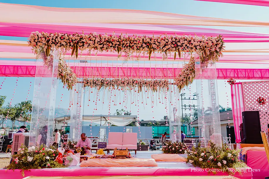 Swathed in hues of pastel pink and supported by acrylic pillars, this couple’s wedding mandap exuded dreamy vibes!