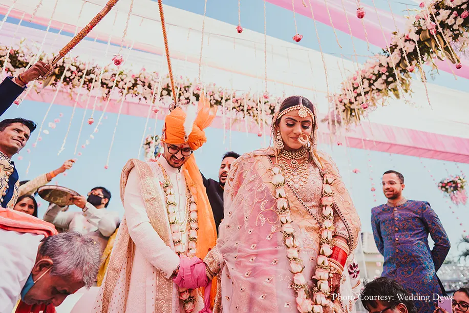 Bathed in pastel pink hues and adorned with delicate blooms, the wedding was a dreamy affair. Hosted under the clear blue sky, the union featured a transparent acrylic pillared mandap with suspended pink roses. Flanked by her squad, Nehal looked stunning as she danced her way down the aisle! Chetan shares, “Since it was slated to be a morning wedding, we used gentle pastel colors that would be enhanced underneath the sunlight! The mandap, of course, was the center of attention with its transparent pillars that gave everyone a clear view when the duo took their vows.”