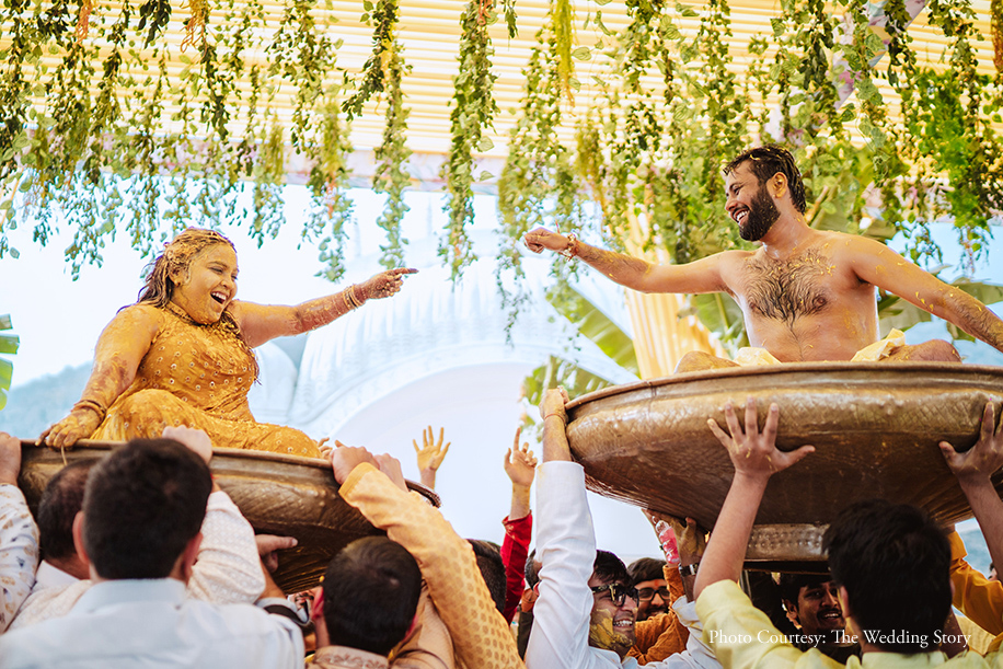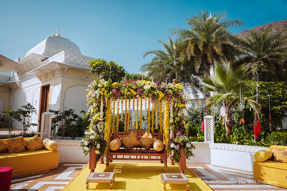 Starting the celebrations off with a laid back mehndi at the JW Marriott Jaipur Resort & Spa, Nidhi and Aditya made the most of their time under the sunshine as they and their loved ones got henna patterns applied on their hands. Surrounded by blooms and seated on a swing, Nidhi was all smiles for the camera, while her relatives shook a leg to the beats of the dhol.