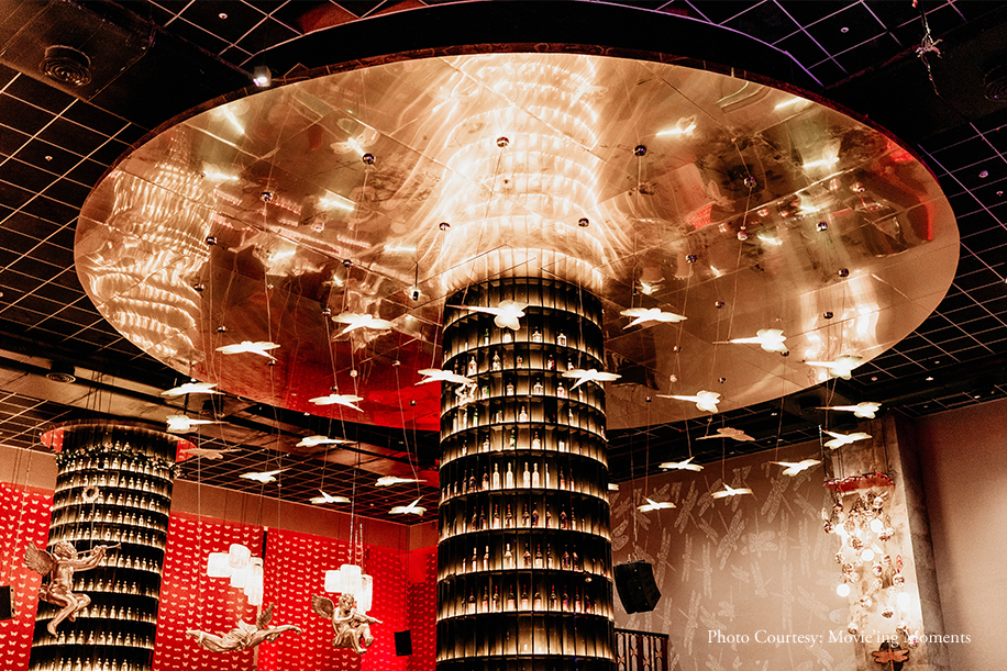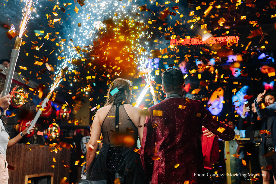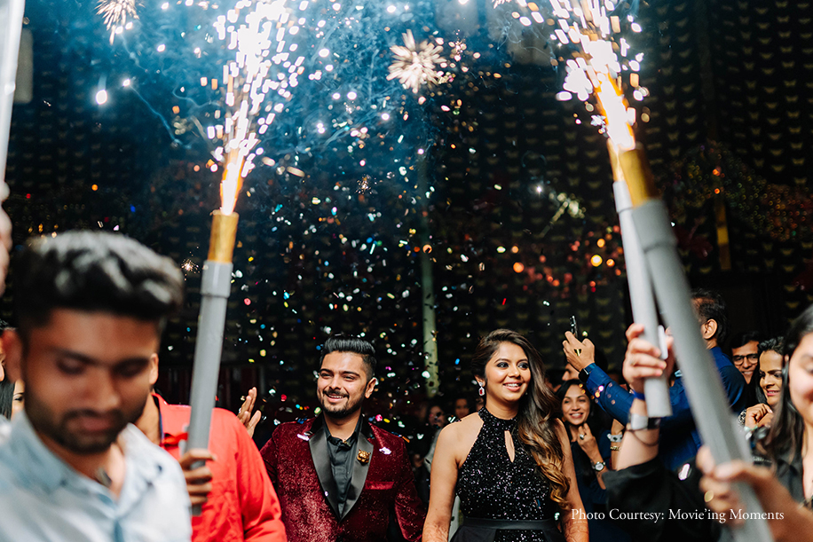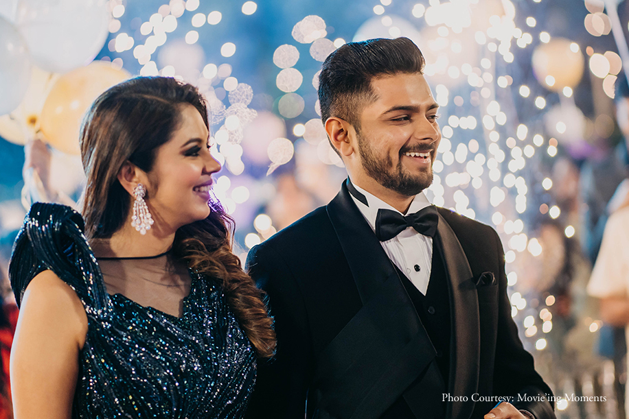 Their cocktail party themed ‘Shimmer Night’ saw lots of glitter and a whole lot of shimmer where the couple made a jaw-dropping entry in complementing black and red outfits, and the guests welcomed them with party poppers and pyro fireworks. Post the cake cutting, the guests poured down their drinks and showed-off some epic dance moves. Nidhi took glam to a whole new level in an EyeCandy by Pinky and Sheshank black outfit.