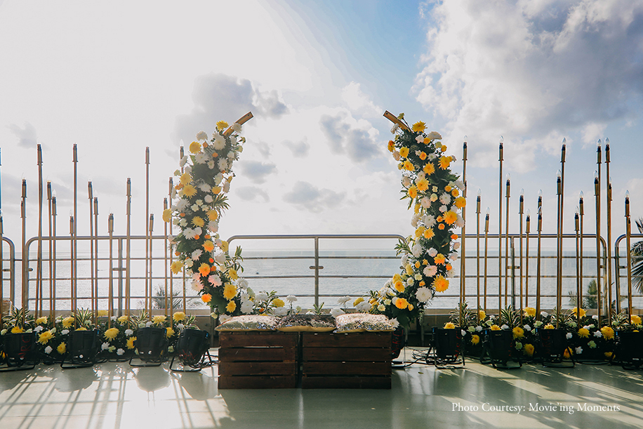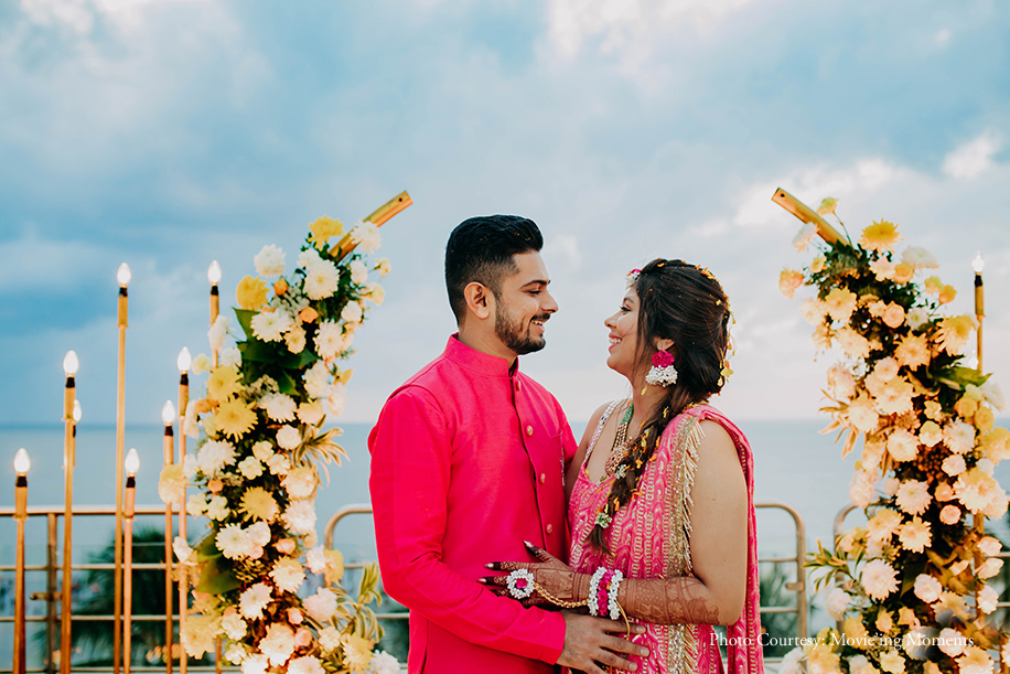 After their wedding invitation got drafted and crafted at the Lagan Lakhvanu and Mameru ceremony, the couple hosted the Haldi ceremony overlooking the Arabian Sea following a bright yellow and classic white color palette for the decor. Dessert stalls with candies and ice-cream were a favorite amongst the guests. Floral backdrops, dhol walas and lots of Holi colors were enough to set the festive mood for the evening. The bride and groom were glowing in their matching pink outfits.