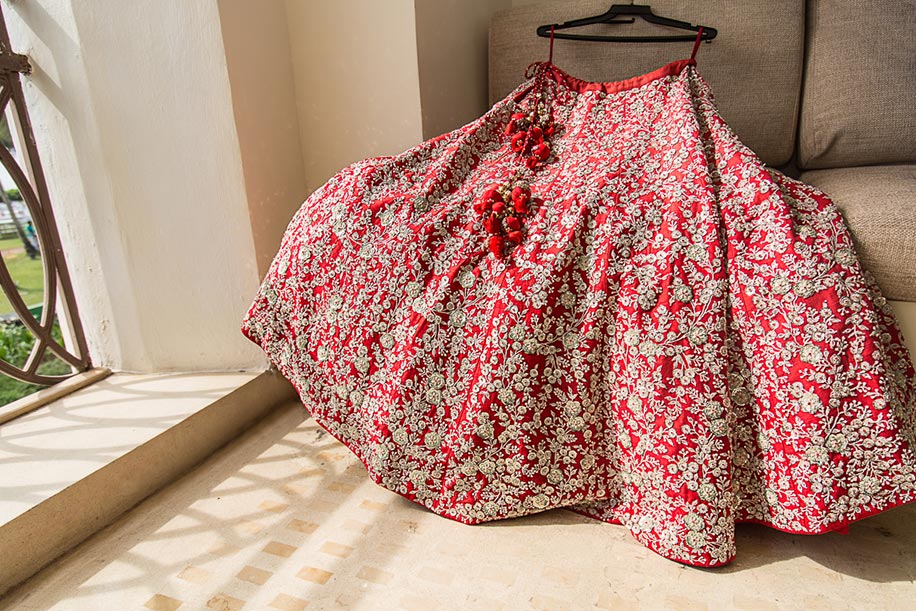 Guests were treated to cocktails, soothing foot massages and games. This was followed by the baraat ceremony in the afternoon, which then seamlessly eased into the pheras. I wore a traditional red lehenga with heavy embroidery and kundan jewellery in honor of the grandeur of the day.