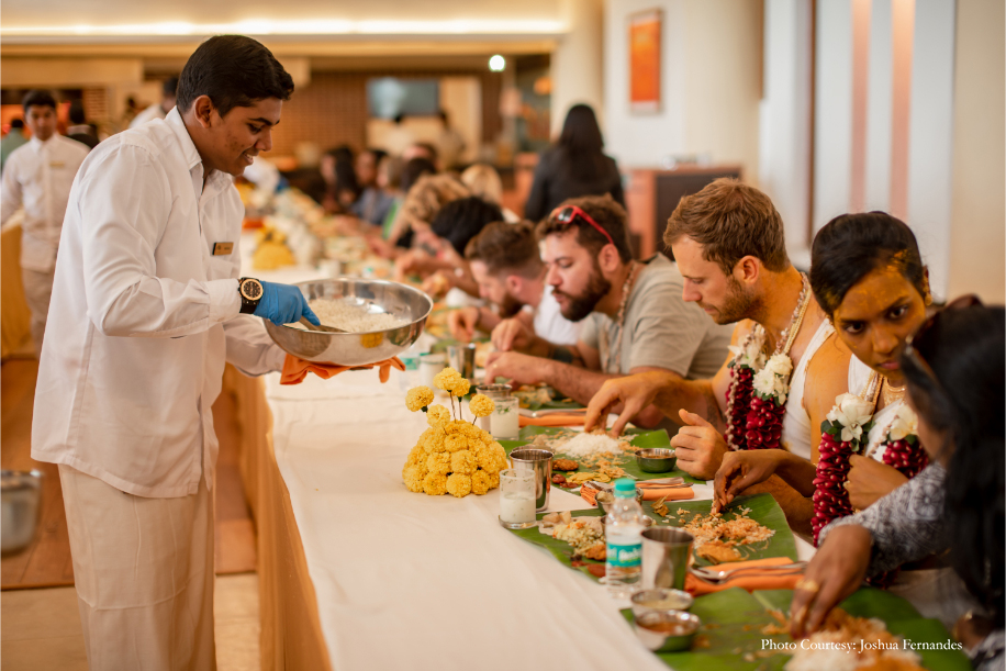 The lawns of the venue were decorated with yellow canopies staying true to the theme of the function. Nikita and Chris chose to wear a Kasavu saree and mundu respectively, as they happily posed on a swing decorated with floral arrangements that made for stunning photos. This was then followed by a traditional sit-down dinner served on banana leaves.
