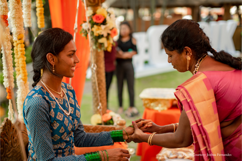 The mehndi ceremony was a simple one filled with intimate emotions and special moments that made it a memorable affair. The bride opted for a subtle Arabic mehndi design with Chris’s name written in the center of the pattern. A bangle ceremony too was held where Nikita was made to wear the traditional green bangles.