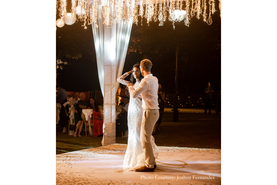The nuptial ceremony was a surreal one by the beach. As the sun gradually began to set, the soothing sea and the golden sand enhanced the decor for this evening. The minister performed the ceremony with the couple looking happier than ever. Nikita looked gorgeous in a white Aurora styled gown paired with a tiara and Swarovski diamond set, while Chris chose to wear a beige suit. The serene decor for the ceremony was subtle with white and pink blooms festooning the arch. The nuptial ceremony was followed by a celebration where the couple danced under starry skies and the venue was enhanced by a lit-up ceiling.