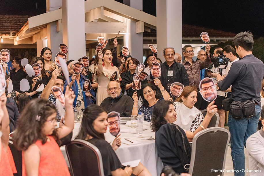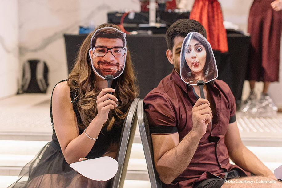 “We wanted to ease all our guests into the wedding celebrations through our welcome dinner. Therefore, we went with the theme of ‘Beers and Beanbags.’ This was a casual dinner with drinks at the pavilion, and the ambiance was very relaxed. Bean bags made up most of the seating arrangements and string of yellow bulbs lit up the entire place. The dress code was shorts and shirts for men and short dresses/playsuits/jumpsuits for ladies. For this event, I wore black playsuit with an outer skirt designer by Anjali Mahtani Couture.”