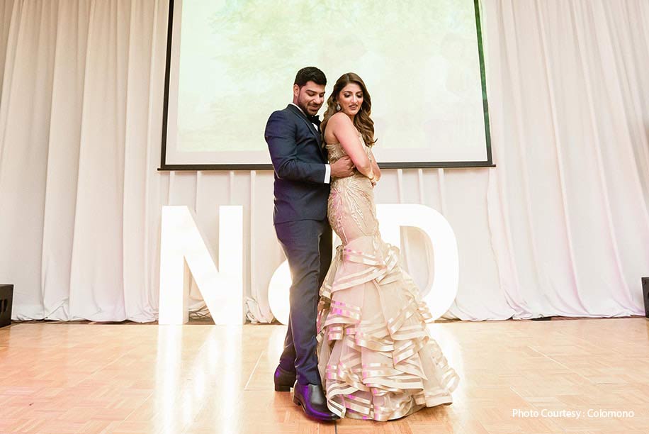 “Our reception was the only function that took place indoors. Black and gold were incorporated into the color scheme of the decor for this event. My sister and Darshan’s sisters and sister-in-law planned the performances. I just said that we wanted something short and meaningful and they delivered just that. We loved it. I wore a golden gown by Anjali Mahtani Couture for this function.”