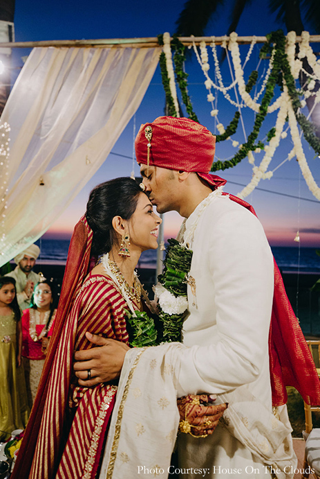 Crafted out of bamboos and swathed in benarasi silk, this couple’s eco-friendly, beachside wedding mandap exuded elegance.