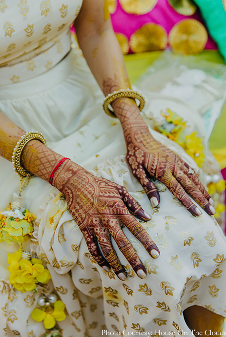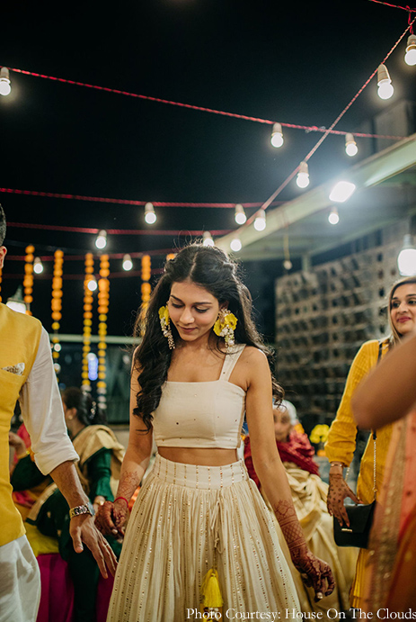 However, for my Haldi and Mehndi ceremony, we zeroed in on a rooftop venue and the decor was quite similar to Kunal’s Haldi. The only difference was that instead of fairy lights we chose diyas for the decor. It was a beautiful day with the winter sun gently warming us as the breeze blew softly. Everyone wore yellow while I donned white and my mom ingeniously designed floral jewelry for me and additionally, even designed 100 more pairs of multi-hued earrings for all the guests. She also created the little chaddar that was held over my head while the rituals took place. In doing so, we ensured that there was a personal touch to the function.”, shares Nikita.