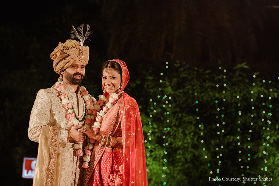 The beautiful bride wore a traditional red lehenga which was paired with a choli with embroidered floral motifs and a contrasting rose gold dupatta. Her look was completed with an elegant necklace, earring, bangles, and a matha patti. The groom donned a heavily embroidered beige sherwani with a golden dupatta. He also wore beaded jewellery and a golden turban with a brooch.