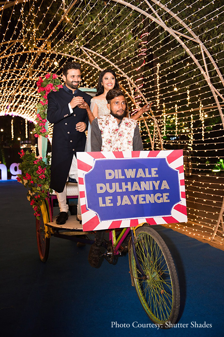 The next event was the sangeet ceremony which had a 90’s retro theme to it. All the major performances were on the hit tracks of that era. Guests loved the Shah Rukh Khan numbers that made everyone quite nostalgic. Nikita chose a delicately embroidered light blue lehenga with an off-shoulder choli and a tulle dupatta for this event, and Umang donned a matte black regal sherwani. The couple made a filmy entry at the venue on an open-air cycle rickshaw with a board that read, “Dilwale Dulhania Le Jayenge.”