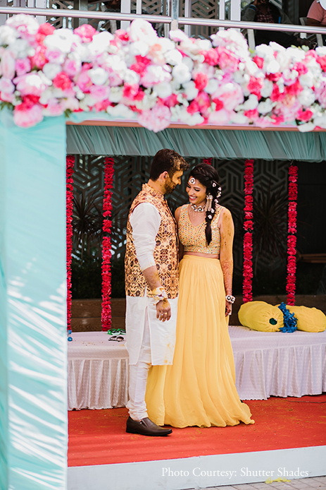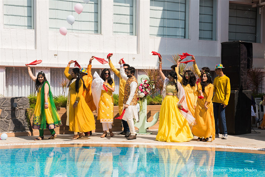 The Haldi function was combined with a pool party. The venue had a vibrant pink, white, and yellow floral decor. The couple danced their way into the venue as the guests welcomed them with colorful smoke bombs. Nikita looked lovely in a light yellow lehenga and a choli with colorful mirror work. She completed her look with floral accessories and a gorgeous side braid. Umang went with a white kurta and a Nehru jacket with floral motifs.