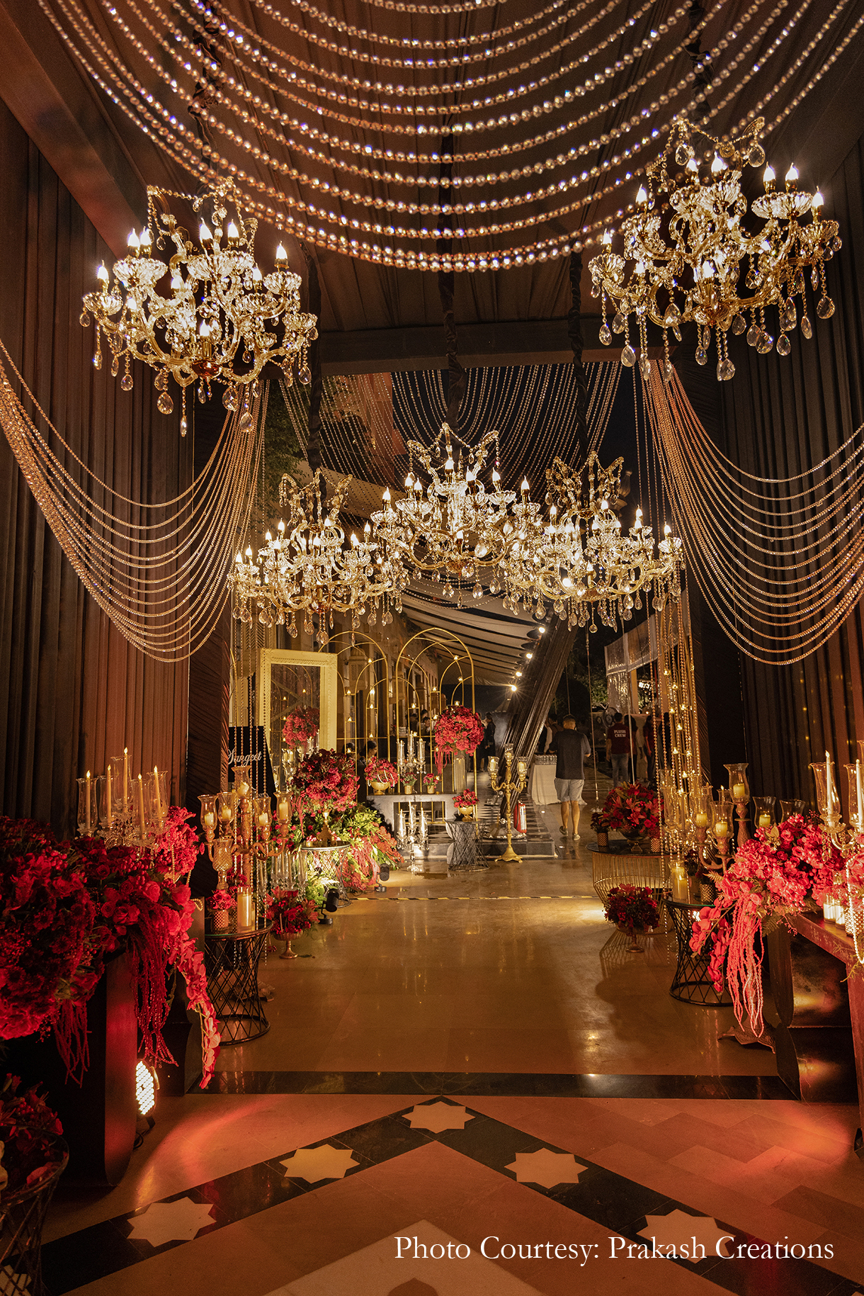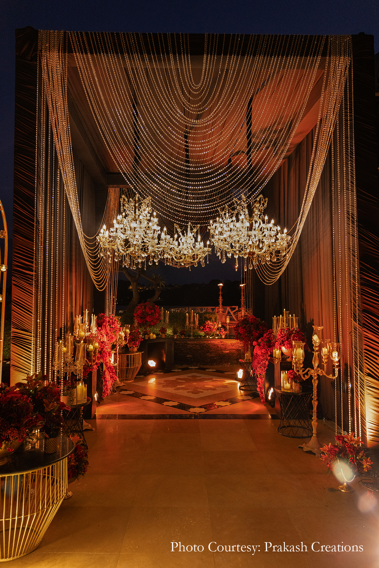 The Sangeet was imagined as a decadent Sufi Night, brimming with the opulence and charm of gilded elements, crystals, candles, glass votives, antique chandeliers, and the richness of red roses. Set with a canopy of branches, roses, and stunning chandeliers, the stage offered a magical backdrop to the evening’s performances and entertainment.
