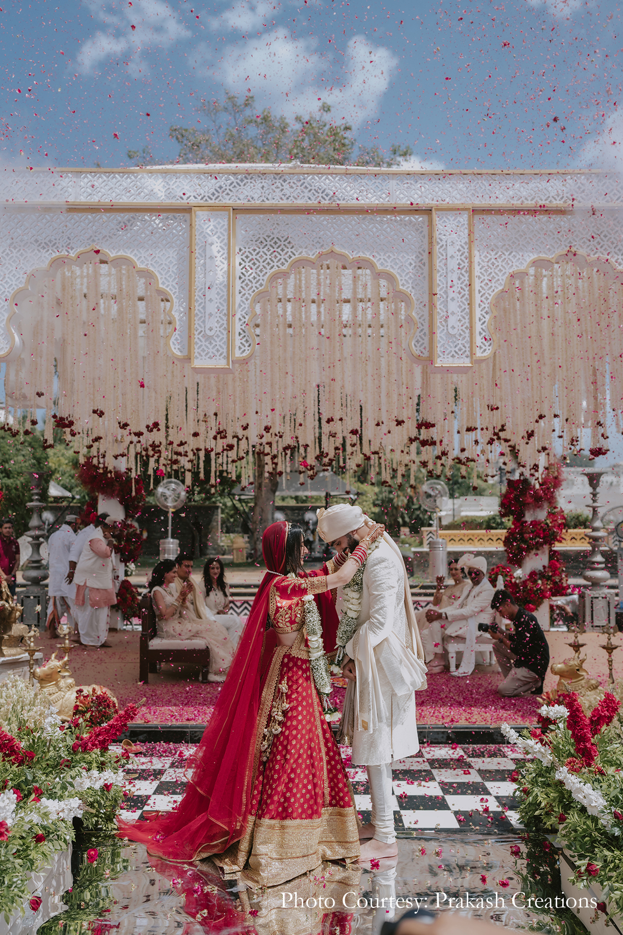 Hosted in the outer courtyard by the lake, the wedding conjured up an image of pure opulence and royalty. The mandap and other decor structures were imagined with traditional palatial designs and architecture to provide a seamless harmony with the hotel’s ornate facade. Rich arrangements of red roses looked strikingly beautiful against the white decor palette. The groom arrived in a vintage red Rolls Royce, while the bride made her entrance on a personalized track beneath a stunning canopy adorned with pearls and red flowers. Dressed in red and white, the couple looked transcendent as they took their vows.