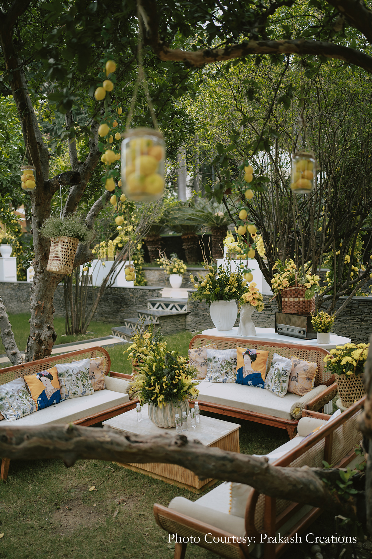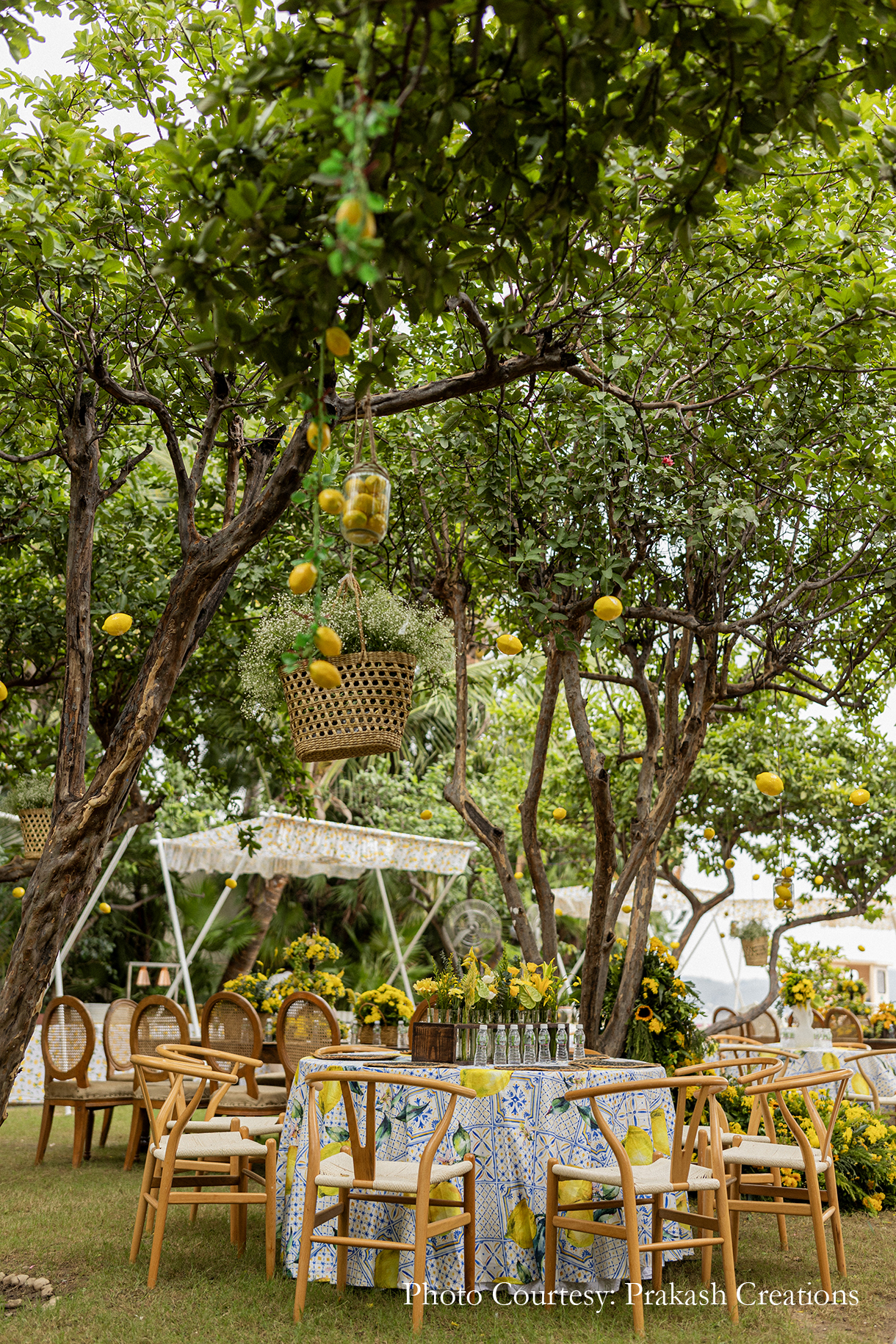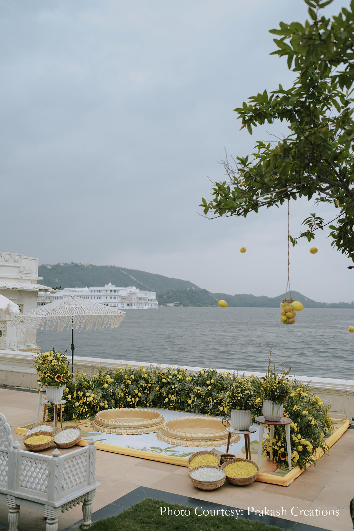 Framed by the serene backdrop of the lake, the Haldi was hosted amidst the lush greenery of the Guava Garden. The traditional yellow decor was given a chic modern update with the inclusion of white-and-blue linen and tons of Italian lemons. From being added to the table arrangements and floral setups to being hung from the trees in little jars, the lemons added a refreshing and unique touch. Dressed in shades of yellow, the couple looked radiant as their loved ones anointed them with turmeric and showered them with love and blessings.