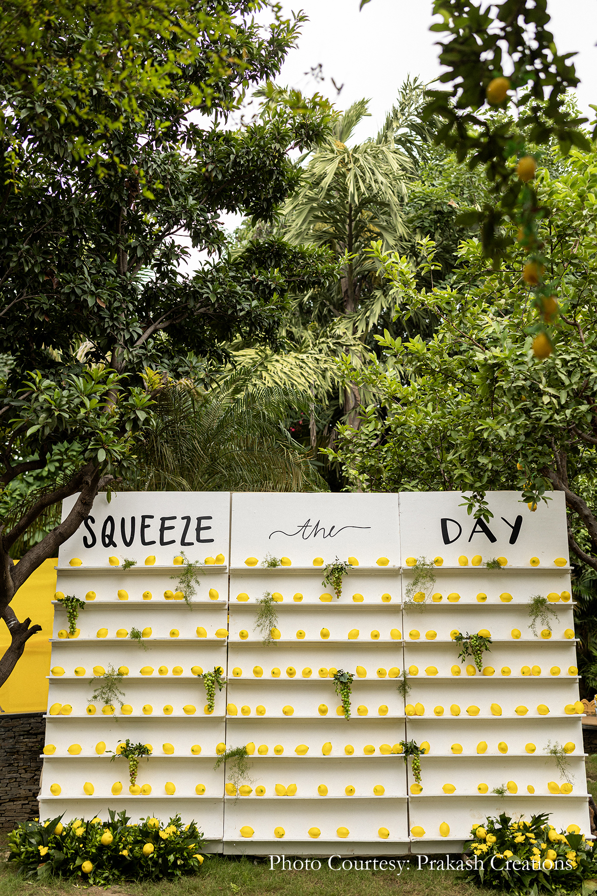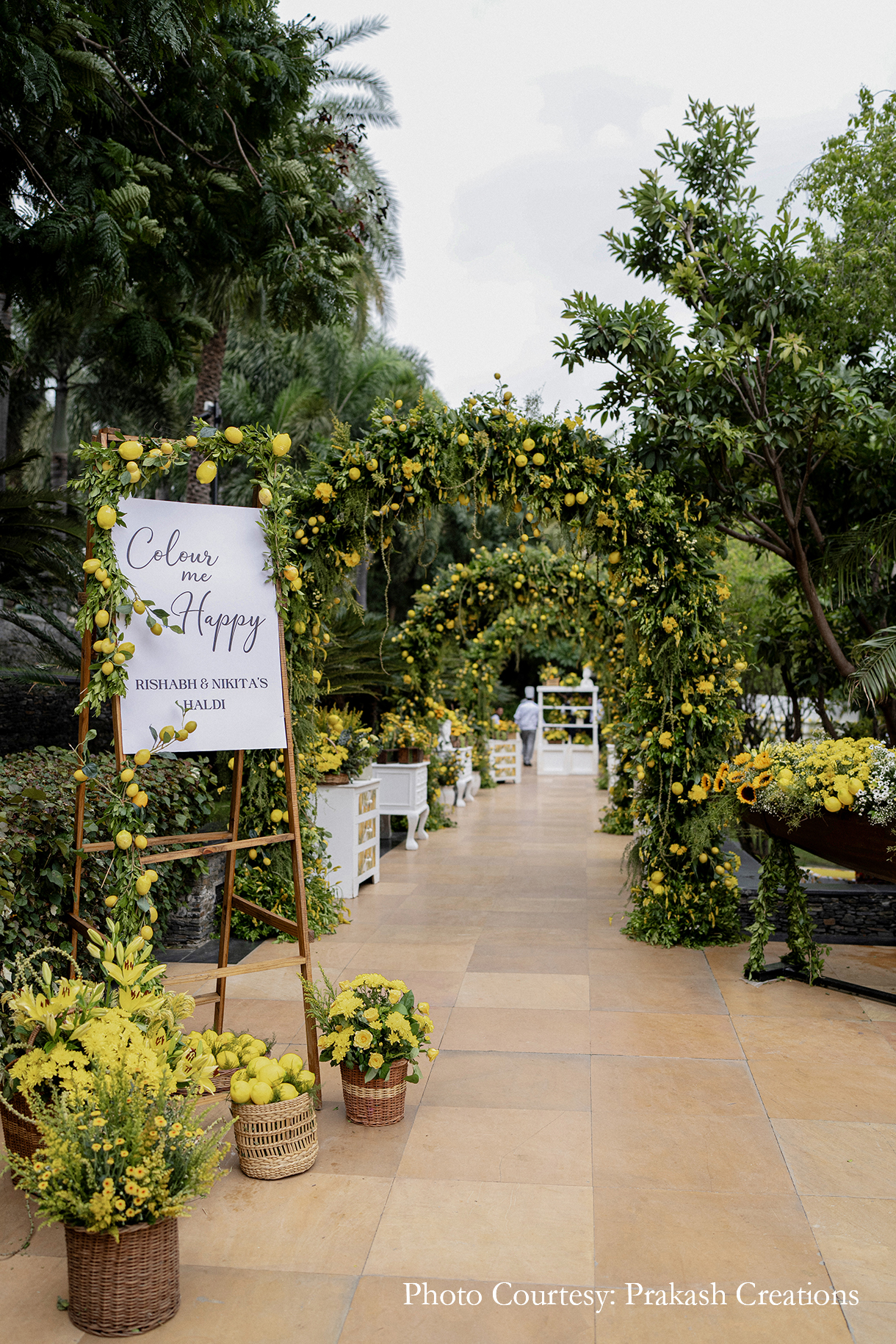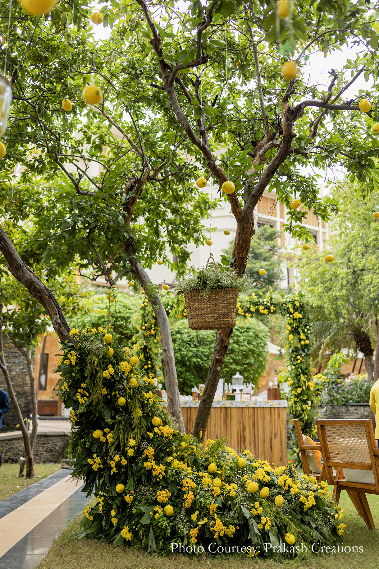 Framed by the serene backdrop of the lake, the Haldi was hosted amidst the lush greenery of the Guava Garden. The traditional yellow decor was given a chic modern update with the inclusion of white-and-blue linen and tons of Italian lemons. From being added to the table arrangements and floral setups to being hung from the trees in little jars, the lemons added a refreshing and unique touch. Dressed in shades of yellow, the couple looked radiant as their loved ones anointed them with turmeric and showered them with love and blessings.