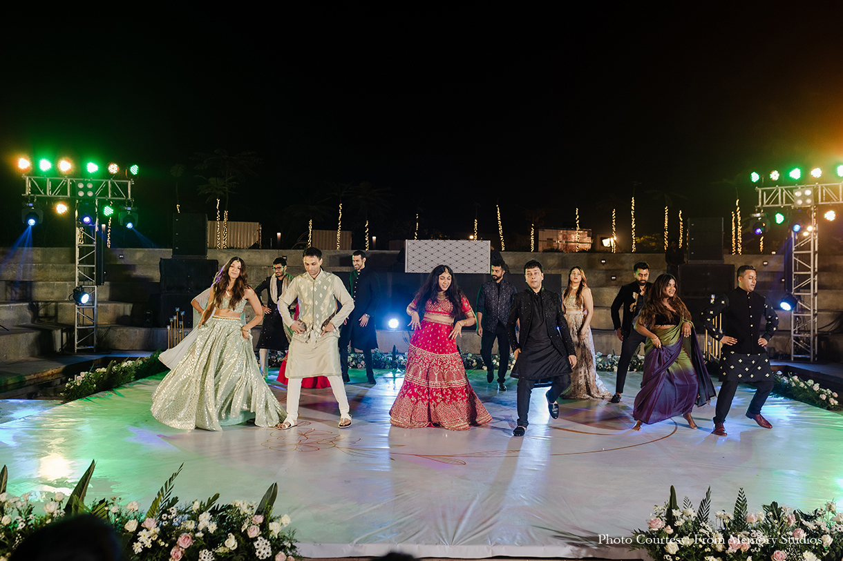 Brimming with love, laughter, and delicious cocktails, the Sangeet function unfolded in the stunning amphitheater space of Amita Rasa. Elegant floral arrangements and candle votives encircled the center stage with a touch of festive grace, where the evening’s entertainment came alive with warm speeches and memorable performances.