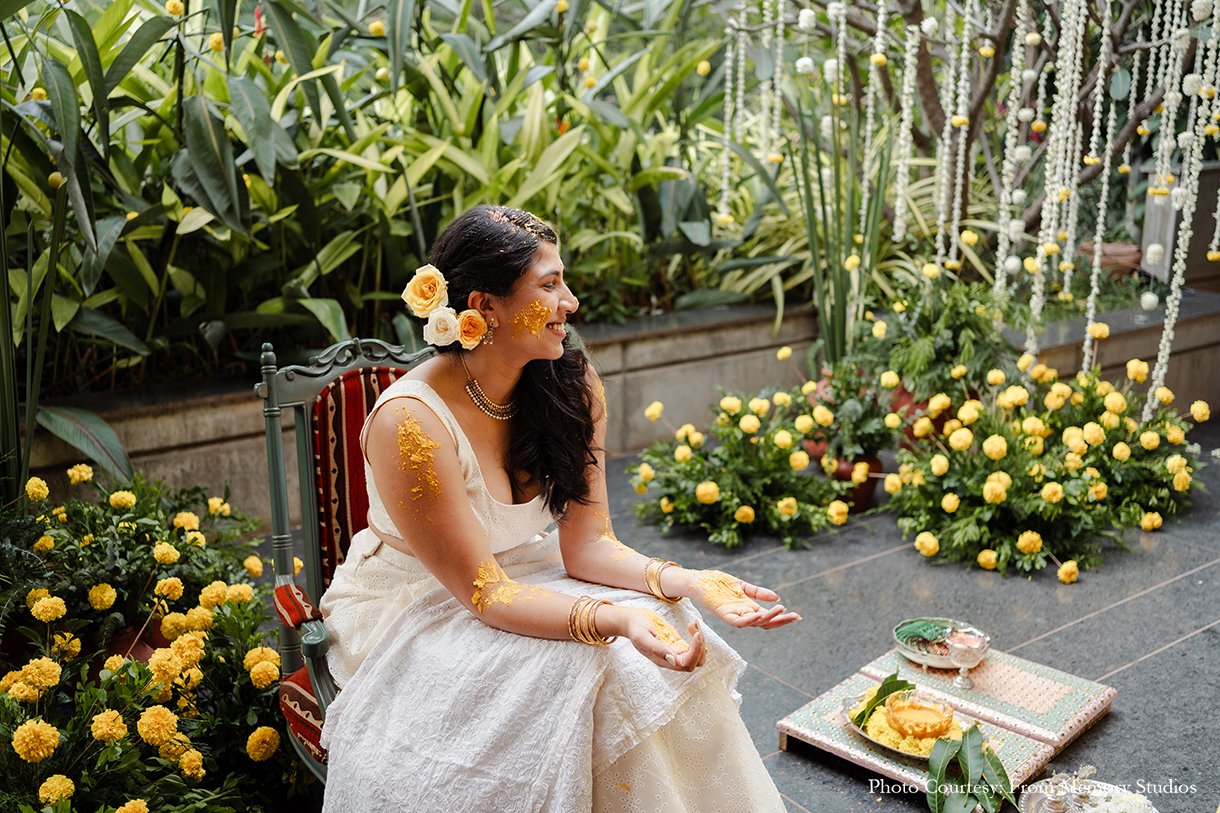 Hosted at the bride’s residence, the Haldi morning unfolded with lively exuberance! Bright yellow marigolds and lush greenery lit up the earthy space with their charm, as friends and family gathered around the radiant bride to anoint her with turmeric and shower her with blessings. Nisha opted for a soothing white lehenga for the ceremony, after which she changed into a mustard saree for other pre-wedding rituals.