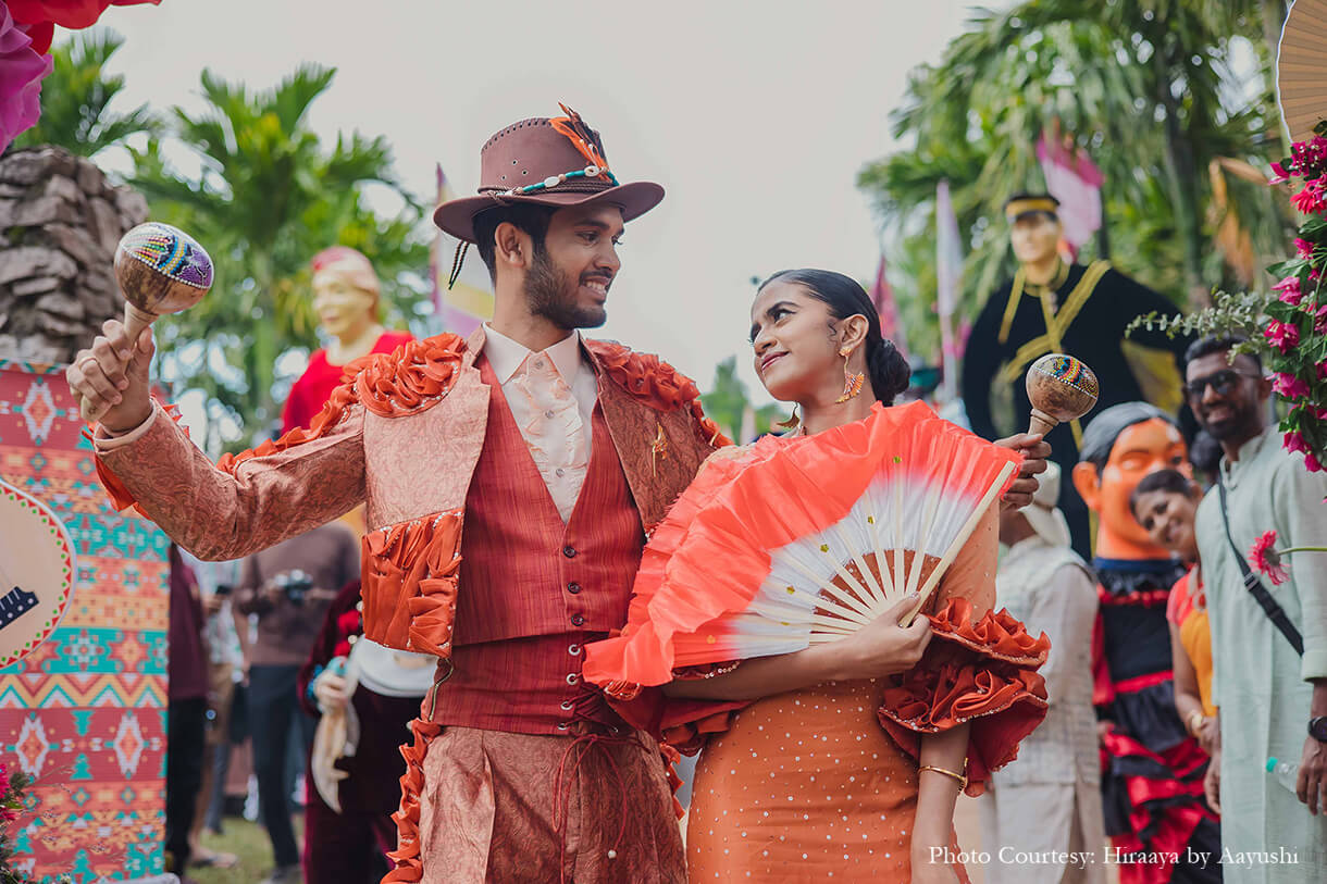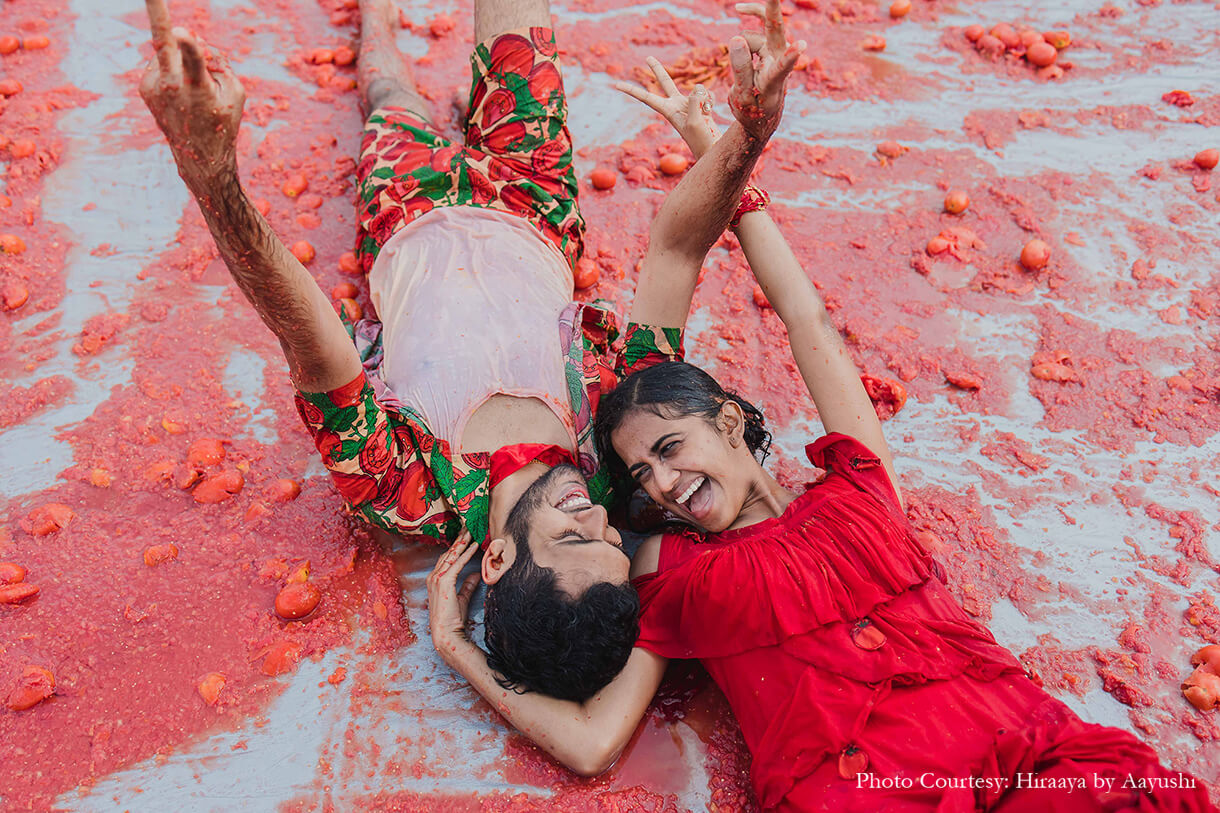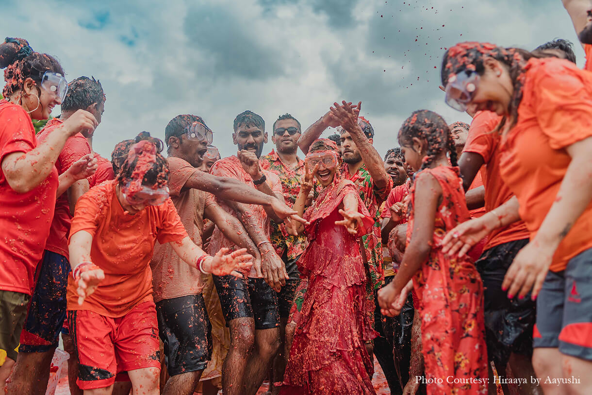 From a Tomatina-themed haldi, a private train party to a traditional temple wedding - this couple embraced their roots and experimented with international themes at their wedding.