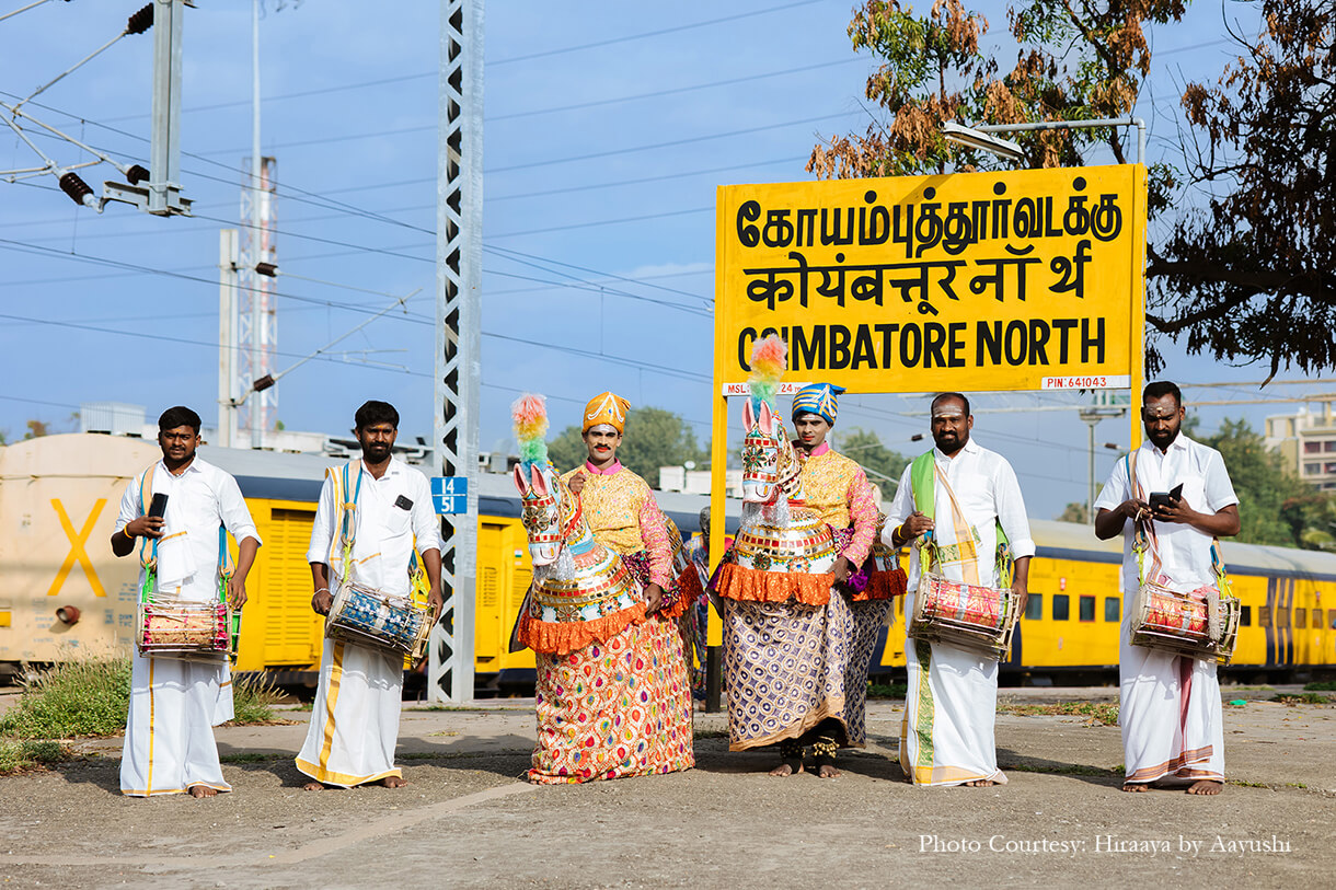The couple shares, “The wedding being on the lands of the mighty Cholas, the journey of our guests had to resonate the same. The concept of the train is the journey backwards from 2023 AD to 900 AD. Our private train that went from Coimbatore to Thanjaur within six hours and was filled with our enthusiastic guests looking forward to each stop had unlimited entertainment! Authentic Tamil Nadu-style group drumming with a Parai to board games, our guests had it all. The evening ended at the banks of Kaveri with a soulful Kaveri Aarthi, music and fireworks.”