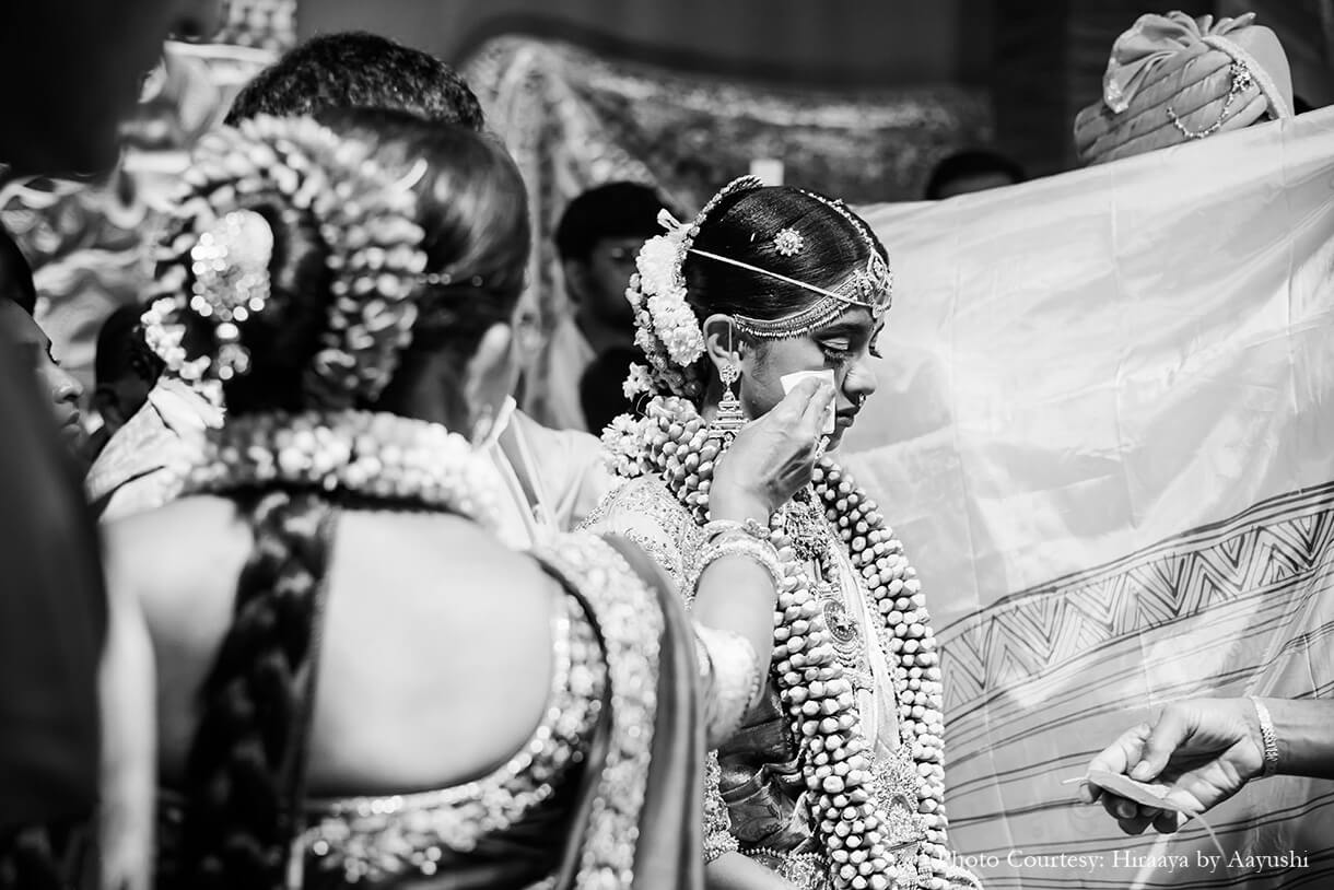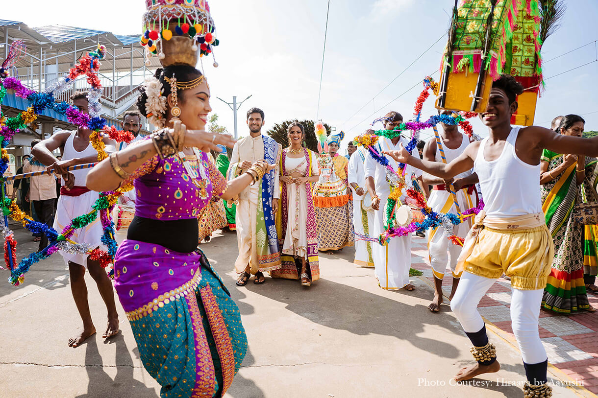 The couple adds, “The final stop to this beautiful journey was in our very own capital of the mighty Cholas, Tanjore. The Tiruvaiyyaru temple is decorated with the most beautiful local and sustainable elements like wheat, rice, turmeric, sacred threads and many more. The wedding was preceded by the elemental procession that paid respect to the five elements of nature through musical instruments and dance performed by artists who carry the age-old art forms even today. The wedding was a traditional Tamil Nadu-style wedding with our loved ones around us.”