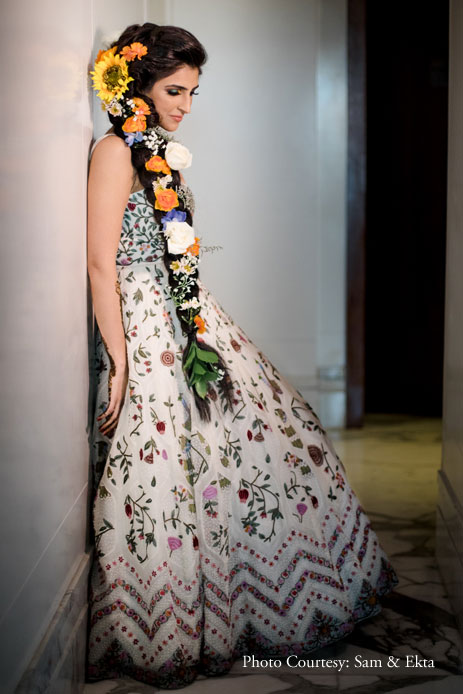 The sangeet was succeeded by the mehndi and ghari pooja the next day. For the mehndi function that was held in the day, a colorful ‘fruit garden’ theme ran central through the decor and outfits. The bride wore a fetching Rahul Mishra strappy gown in white with floral embroidery, her black braid entwined with fresh flowers, reminiscent of Rapunzel’s hair in the Disney film ‘Tangled’. Sacheev looked suave in a breezy powder blue suit from Khanijo.