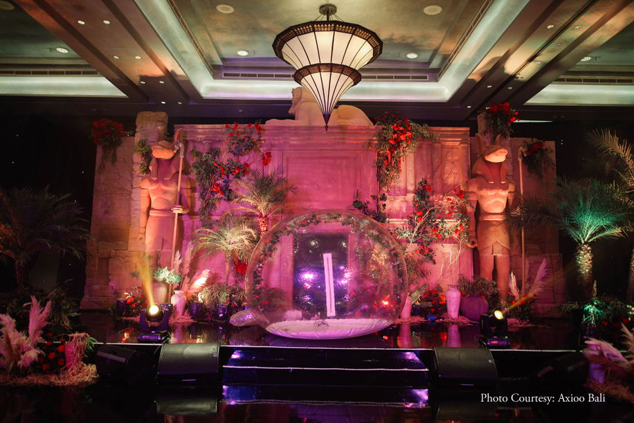 As a couple who loves to explore and travel the world, their sangeet night was one hell of an adventure. The decor, which included Egyptian elements and a red and gold color pallette, was made to reflect their travel diaries. Nooky set the stage on fire with her first-ever dance performance to a Bollywood song. She looked amazing in a pink lehenga with a floral-embroidered cape by Dolly J, accessorized beautifully with stunning statement jewellery. Gautam looked handsome in a black vest with embroidery and pink crystals, and a grey kurta by Kunal Dieu, which matched Nooky’s outfit.
