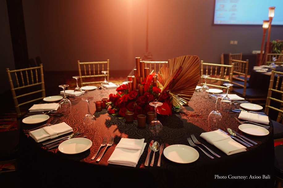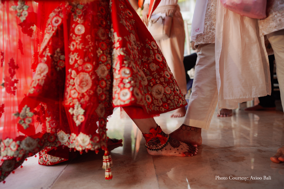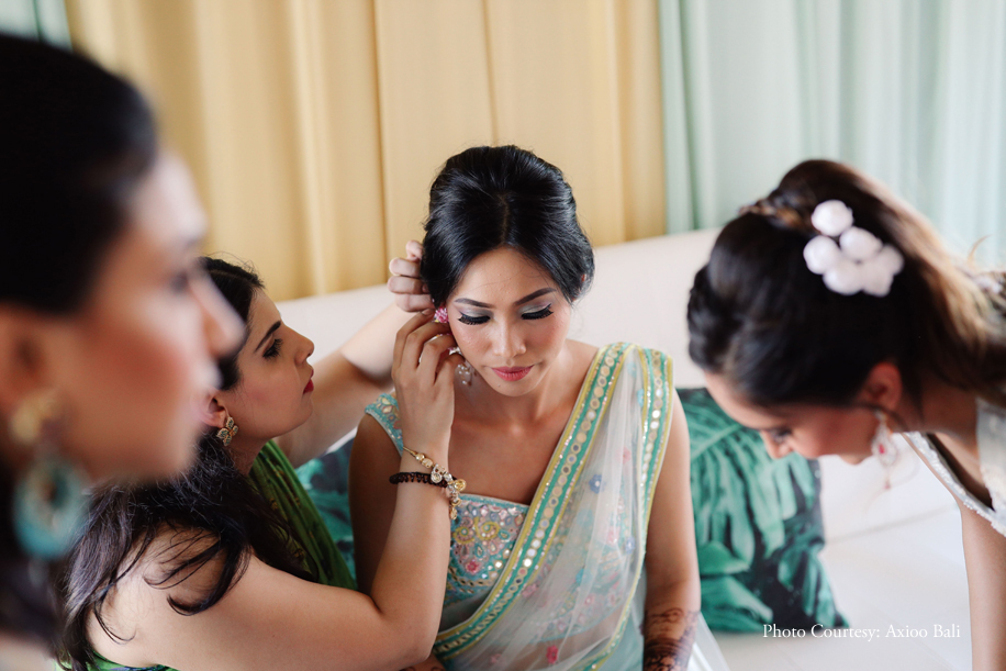 “This was a hard decision as Nooky’s family is from Thailand and were not comfortable with travelling overseas. We considered Thailand as our first option. However, there was nothing exciting about the venues there. We discussed this with our parents and fortunately they were happy to let us choose our own dream destination for the wedding. We both love Bali. Not for just the beaches, but we also love the locals, culture and holy vibe of the place. We made a list of hotels to visit and saw almost twelve properties in Bali. The minute we walked into the Conrad Bali, we knew happy that it checked all our preferences perfectly. Gautam wanted a reception venue with big lobby and high ceilings as he believes that a lot of guests like to assemble in the lobby area to make conversation and get to know each other. Conrad’s lobby has a majestic view facing the ocean. The water garden was perfect for the wedding ceremony as it had a readymade mandap surrounded by water. The 8th-degree restaurant by the pool was a great place to host a mehndi party and the ocean garden, right by the chapel with an open lawn, was ideal for our outdoor reception.”