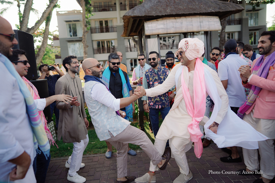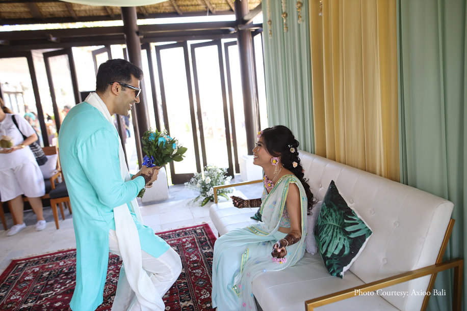 For the decor, they preferred keeping things subtle, not wanting to incorporate too many colors at the venue, which was near the beautiful Nusa Dua Beach. Nooky and Gautam matched outfits for this event. She wore a blue and white saree with floral embroidery and mirror work by Elisha Wadwah, while he arrived in with a blue kurta teamed with a white stole by Sarab Kanijou.