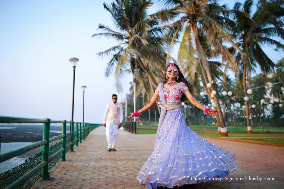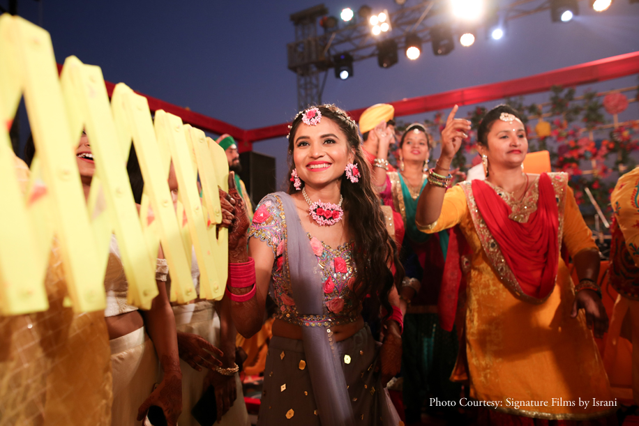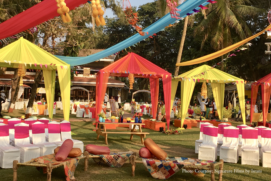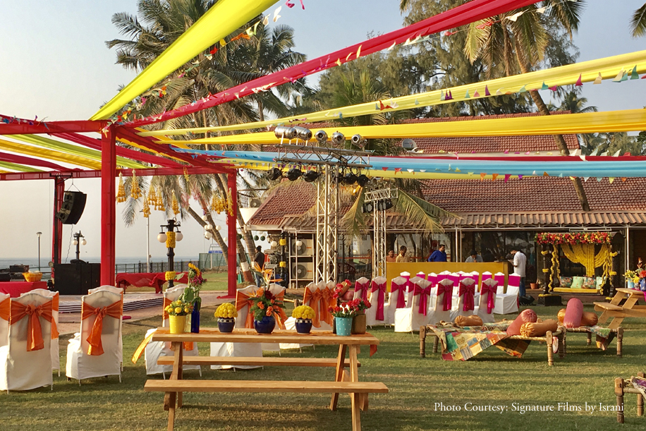 A holi-themed sundowner celebration, the haldi was organized with Punjabi pomp and splendor at the picturesque sea-facing US Army club. The couple was carried in on a traditional rope bed to the beats of Punjabi drummers and folk dancers. Elements like rustic rope beds, Punjabi hair braid ornaments and food counters serving street snacks and drinks helped create a vibe of a true Holi celebration.