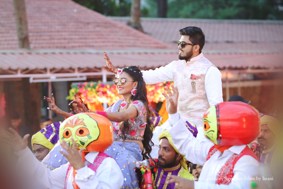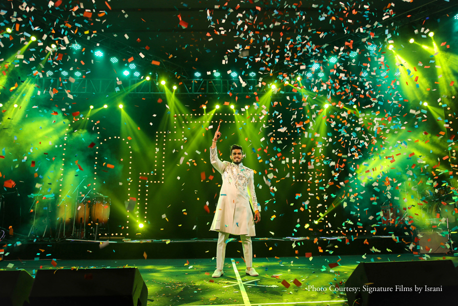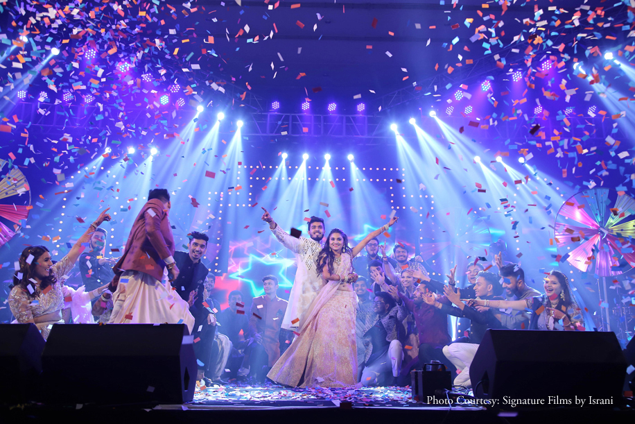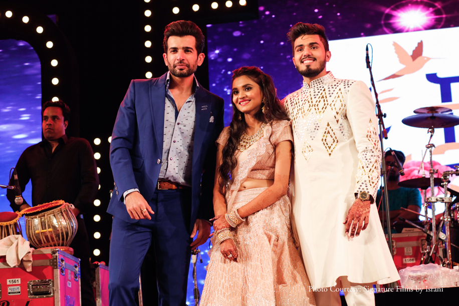 With 2,000 guests and performances that stretched over two hours, Palak and Bhavik’s sangeet was a long gala that kept everyone entertained. Actor Jay Bhanushali anchored the festivities, while the 120-people team of Happy Dancing Feet lit up the stage with their energetic dance performances. Darshan Raval added to the charm of the night with his hits like ‘Chogada’ and ‘Kamariya.’ The groom however, stole the show with his impressive entry on a hydraulic prop in the center of the venue.