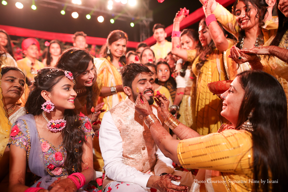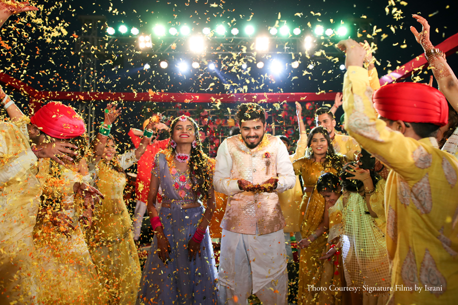 The lively event saw fun activities like bull rides, hopscotch, caricature art, hammer hit, and a mini Ferris wheel that kept the guests entertained, as Anchor Ayush Kumar kept the high spirits going. Soon Rudraksh band took over the night with their power-packed performances, and the haldi, which was a more intimate event, that ended with a shower of flowers.