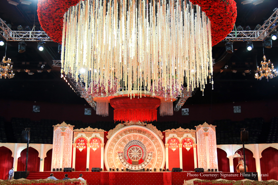 The baraat arrived at 5 pm at the NSCI Dome, with the groom making an entry in a luxurious vintage car. The baraatis danced as the garlanding ceremony commenced. The decor exuded a royal Rajwadi vibe with a color palette of scarlet, ivory, and gold in elaborate floral arrangements and elegant chandeliers. A flute mermaid in a shell structure kept the arena resounding with music after the garlanding ceremony.