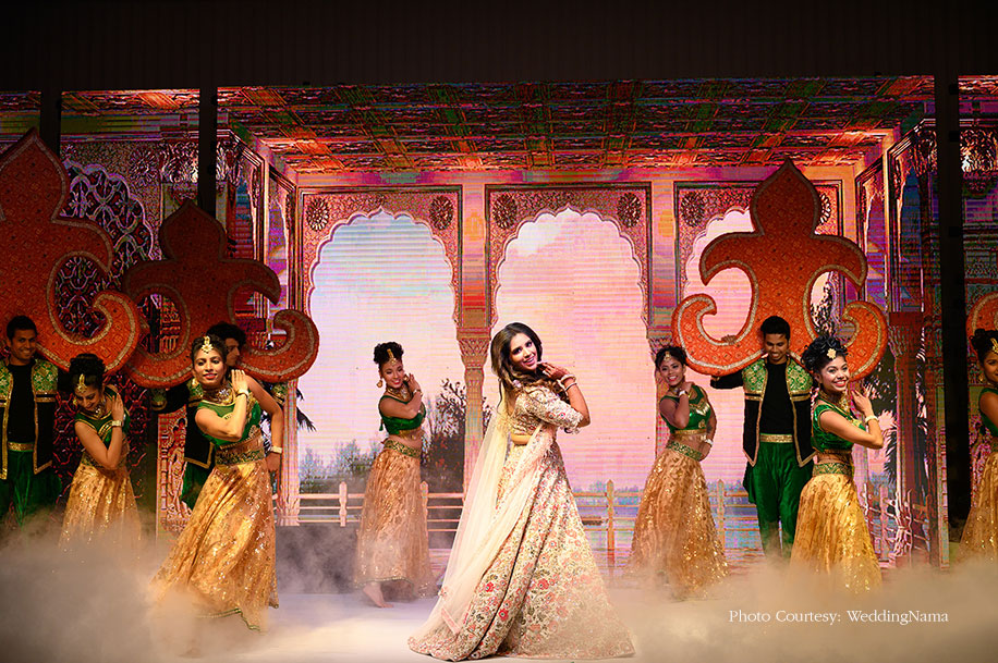 “Our sangeet decor was minimal and extremely well-lit as our families wanted something very classy. The color palette included white and gold hues with about 500 bulbs lighting up the ceiling. And, moving away from the usual practice of having a designated dancefloor, we instead, gave people the freedom to dance anywhere they wanted to.”, shares the happy bride.