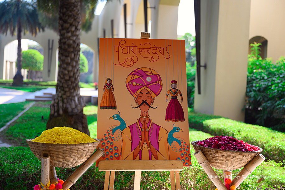 For the lunch spread, Rajasthani print linen was elegantly draped over tables and chairs. Traditional manjis and mudas were also provided for the guests to take a seat on.