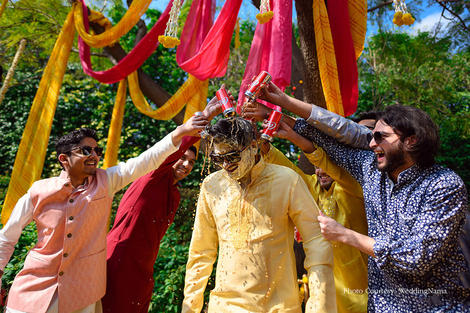The Haldi had a Rajasthani themed lunch, and it also followed a traditional route with colors like yellow, orange, and red being generously used in the decor. However, instead of including a standard backdrop, the duo chose to decorate a tree with drapes and flowers under which they had their Haldi.